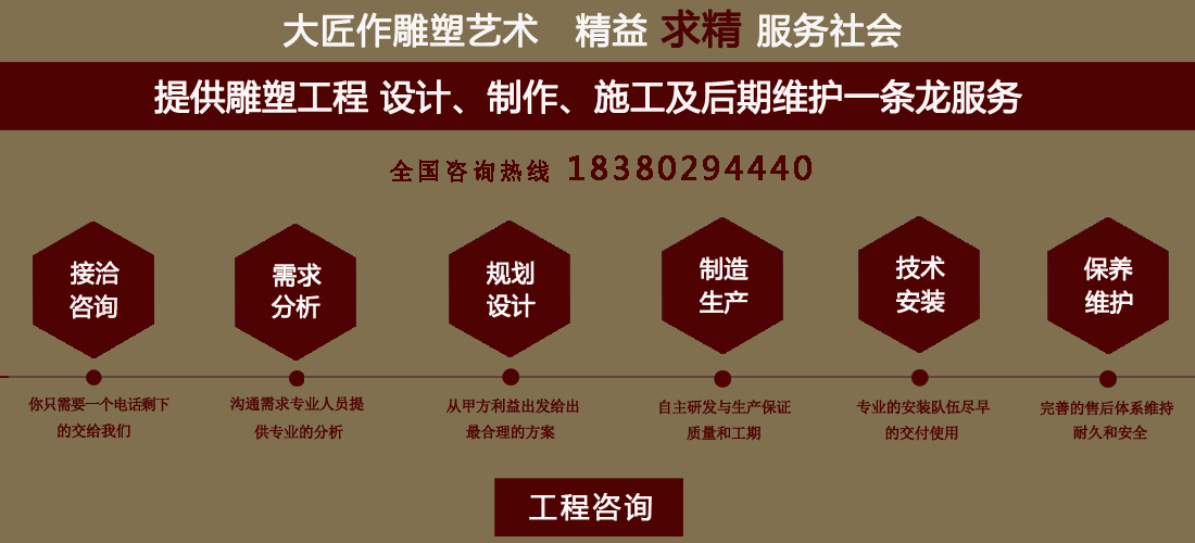 成都大匠作雕塑有限公司,是經(jīng)成都工商局審定注冊(cè)的正規(guī)專業(yè)雕塑制作及工程安裝服務(wù)機(jī)構(gòu),是由一群年輕富有朝氣的年輕人創(chuàng)辦,發(fā)軔于四川省成都市龍泉驛區(qū)。它是一家******于創(chuàng)作、制作和銷售為一體的公司。大匠作擁有多年從事公共藝術(shù)的專業(yè)人員和雕塑制作人組成的核心團(tuán)隊(duì),為您提供專業(yè)、具創(chuàng)新的設(shè)計(jì)及制作服務(wù)。公司成立以來,秉承“******服務(wù)、誠信為本”的宗旨,以客戶需求為目標(biāo)導(dǎo)向,不斷學(xué)習(xí),進(jìn)取,優(yōu)化和提高服務(wù)質(zhì)量,公司向您******——“您的滿意***是我們的信譽(yù)”,我們將以飽滿的熱情和******的服務(wù)贏得您的贊譽(yù)和支持。 愛心,細(xì)心,耐心,責(zé)任心是我們的要求,盡心盡職,為您打造出創(chuàng)新、專業(yè)、******的設(shè)計(jì)方案,我們堅(jiān)信先做人、后做事,用心對(duì)待客戶,實(shí)行透明收費(fèi),人性化服務(wù),本著對(duì)客戶負(fù)責(zé),對(duì)客戶負(fù)責(zé),更是對(duì)自己發(fā)展負(fù)責(zé)的態(tài)度,爭取做到讓每位客戶滿意